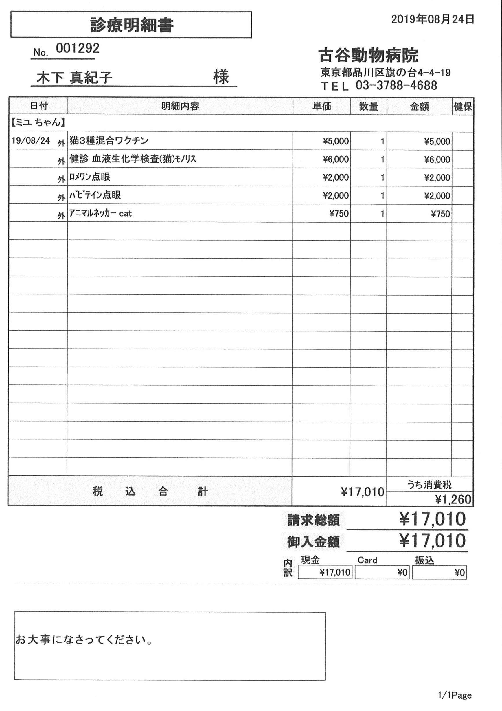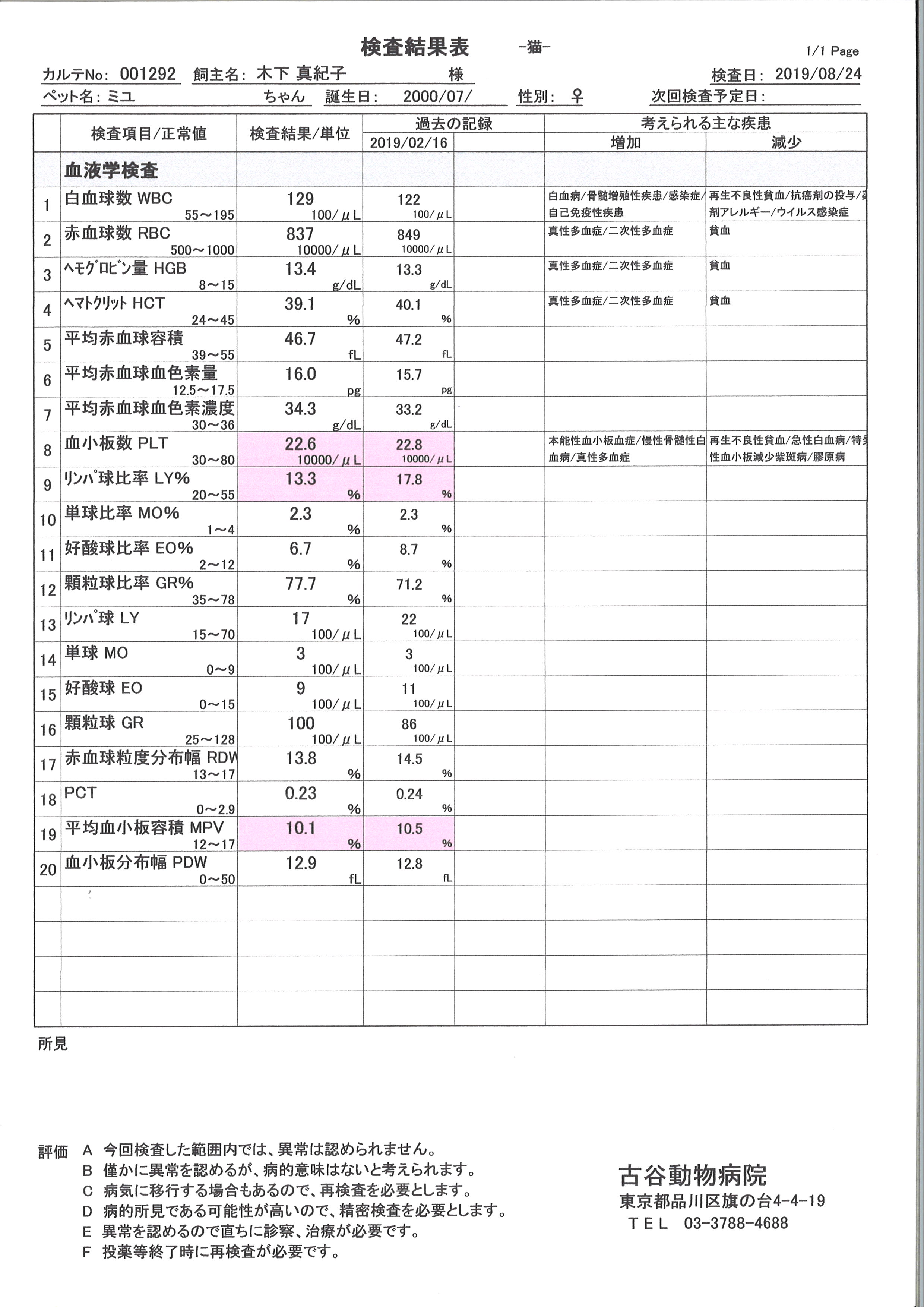 美優:通院メモ 2019/8/26 2019/9/4 その他, 美優メモ カスタムフィールド ごはんあまり食べない 好き嫌いが激しい トイレ問題なし ゲロなし その他左目角膜に傷 総合評価★★★☆☆ 大塚先生多忙で唐沢先生の診察 定期検査とワクチン 左目の角膜に傷あり 抗生剤と角膜再生剤の目薬、エリザベス 生理検査は外部に出すとのこと